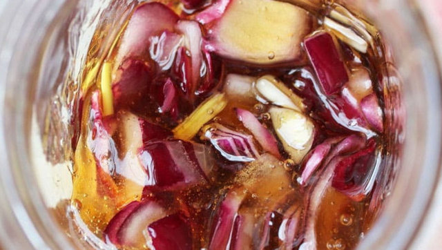- Soğanı iri şekilde doğrayın. Bunun üzerine 1 yemek kaşığı balı koyun. Karışımı bir kavanozun içinde en az 3 saat kadar sulanması için bekletin.